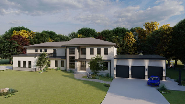 A contemporary house with two stories and a basement. The floor plan includes two separate garages and entries, along with two separate kitchen/living areas on the main floor. The second floor primarily consists of bedrooms along with adjacent living areas.